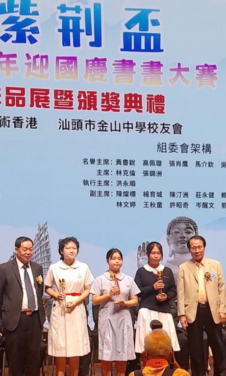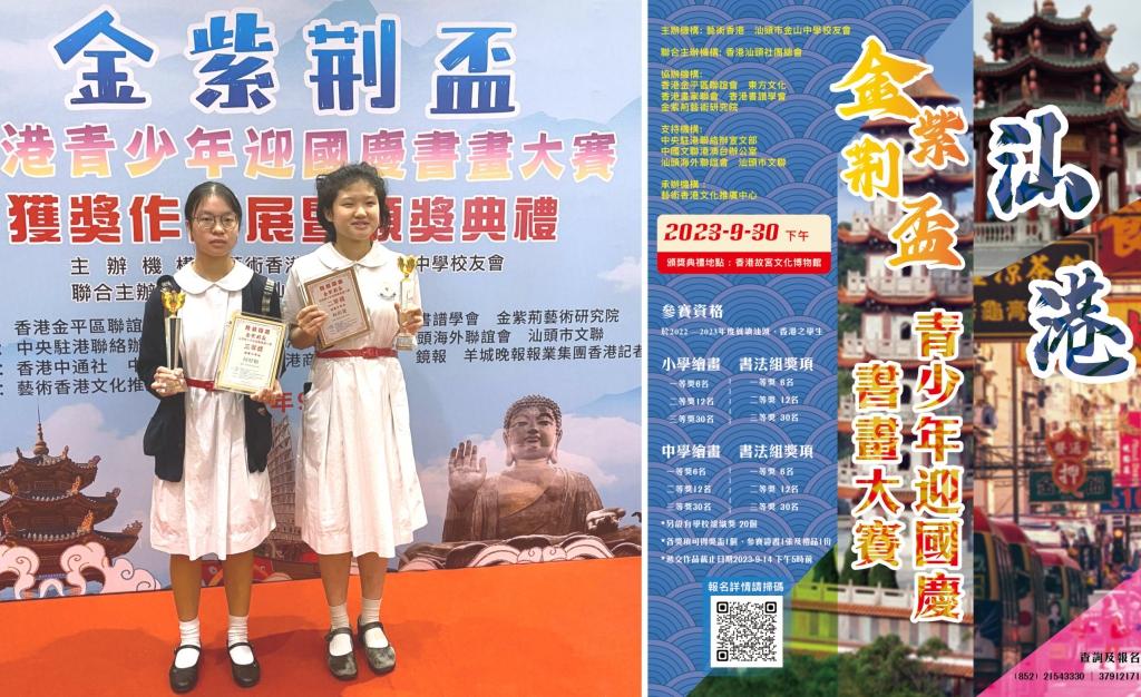 Congratulations to S.4 LAM Meng Yi and HO Hau Yu for winning the Second Prize and Third Prize in the Golden Bauhinia Cup (Shantou-Hong Kong) Youth National Day Painting Competition.金紫荊盃(汕港)青少年慶國慶繪畫大賽,恭賀本校中四級林萌薏,何厚如分別獲得二等獎和三等獎。頒獎禮已於2023年9月30日在故宮文化博物館舉行。