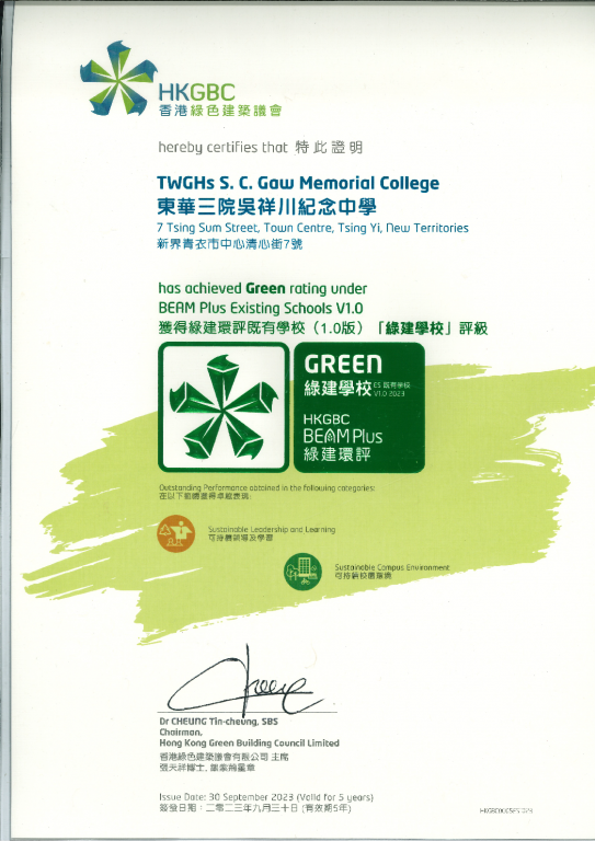 Warmest Congratulations to our school for achieving Green rating under BEAM Plus Existing School